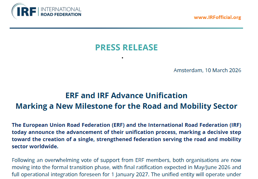 The European Union Road Federation (ERF) and the International Road Federation (IRF) today announce the advancement of their unification process, marking a decisive step toward the creation of a single, strengthened federation serving the road and mobility sector worldwide.