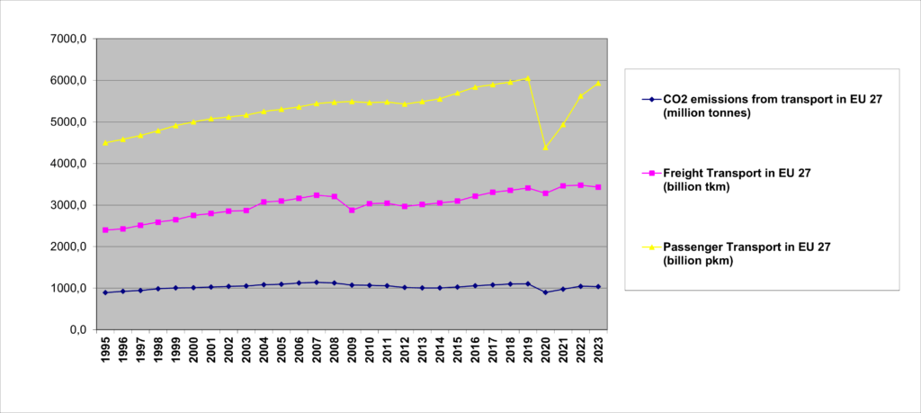 9.1 Comparison between freight & passenger transport evolution and CO2 emissions in EU 27, 1995-2023