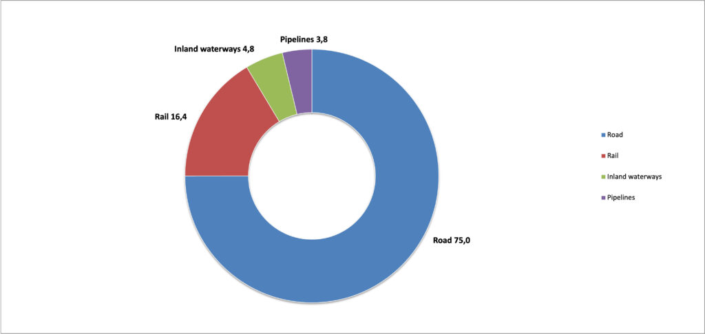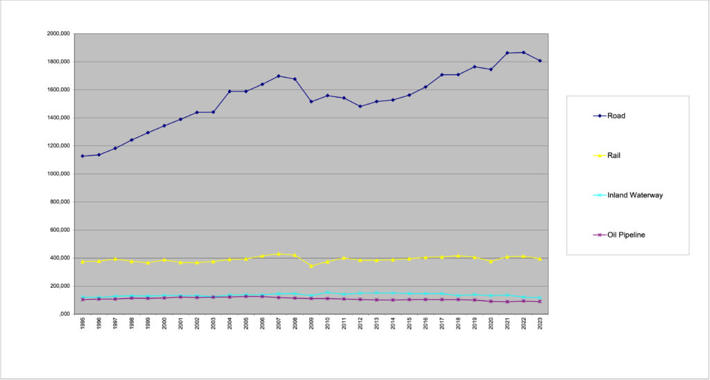 | Road (*) | Railways | Inland Waterways (**) | Pipelines (Oil) (***) | |