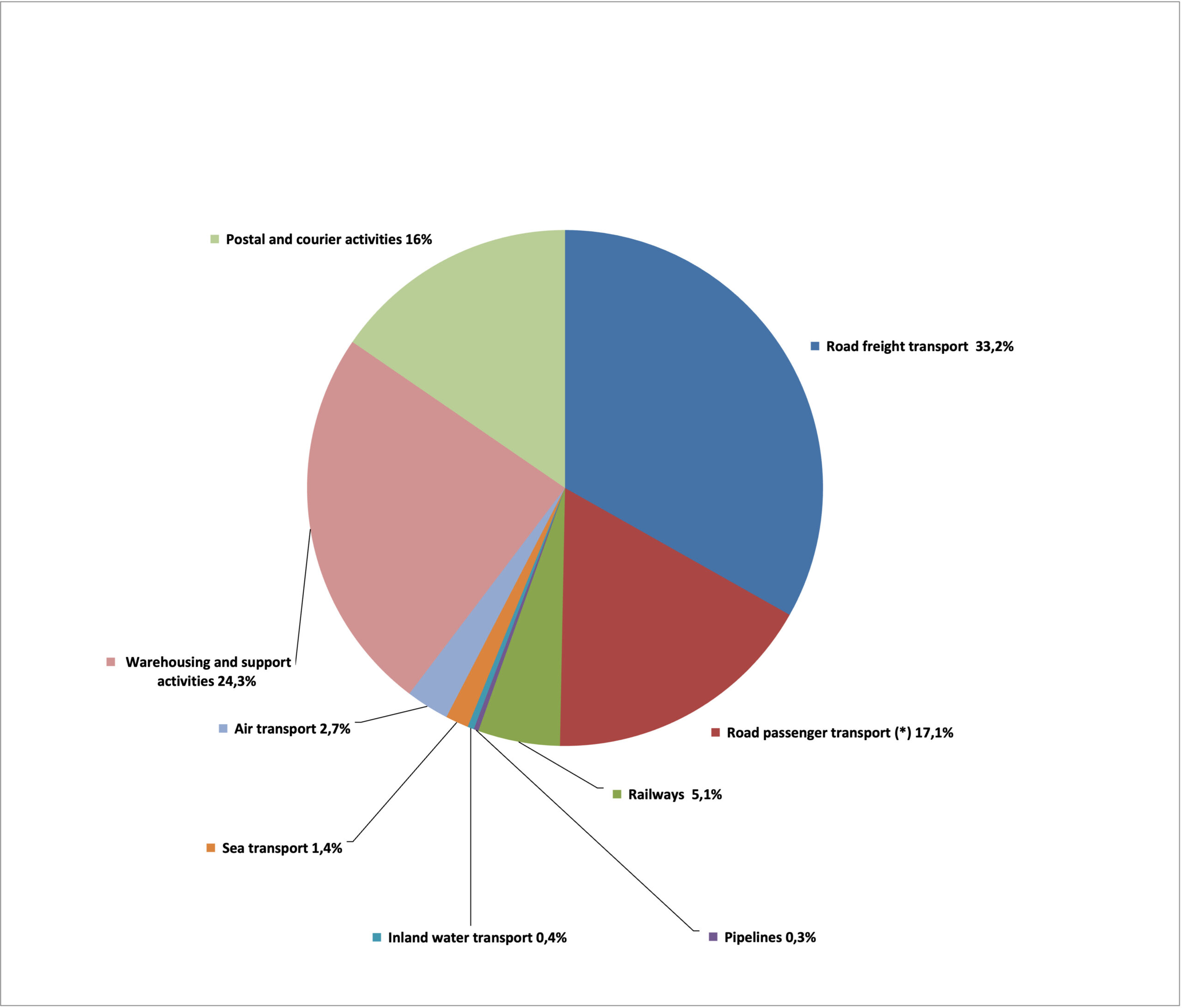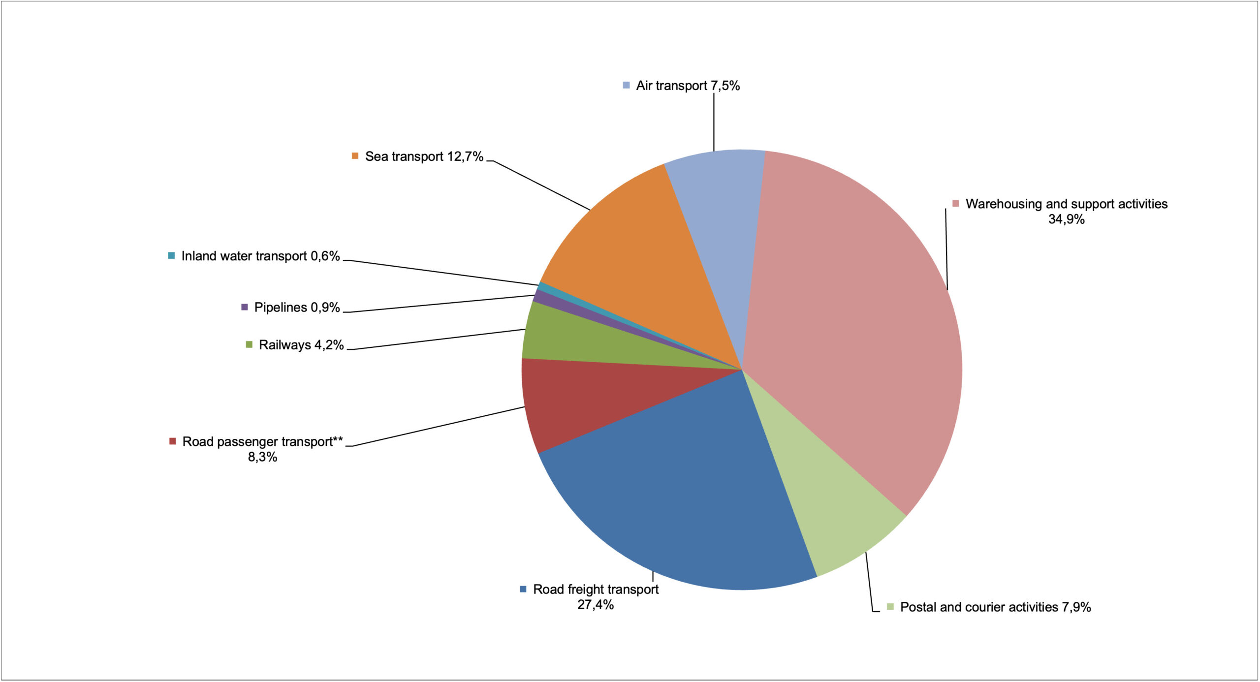 Total Road Freight Transport Road Passenger Transport ** Railways Pipelines Inland water transport Sea transport Air transport Warehousing and support activities Postal and courier activities