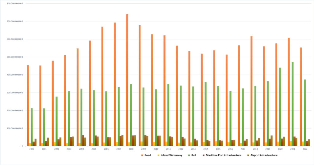 4.4 Distribution of infrastructure investment between modes in EU countries, 2000-2022 (Euros, current prices, current exchange rates)