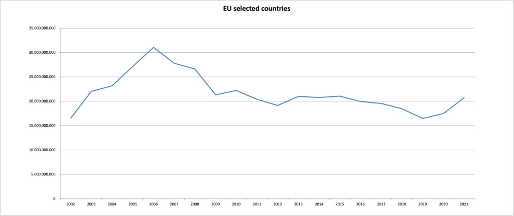 4.6 Maintenance expenditures in road infrastructure in EU selected countries, 2002 - 2021 (million Euros)